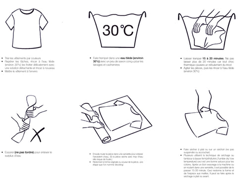 - Essorer (ne pas tordre) pour enlever le surplus d'eau ensuite rouler la pièce dans une serviette pour enlever l'excédent d'eau. (Si la pièce sèche avec trop d’eau elle risque de fouler.)